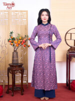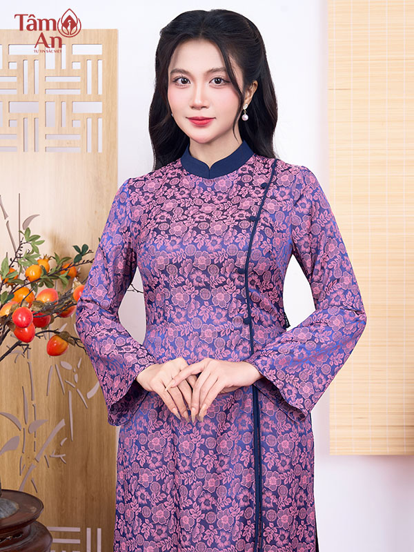 Áo dài Tím Cẩm sử dụng chất liệu gấm nhập khẩu cao cấp, bề mặt vải mềm mịn và đứng dáng tự nhiên. Họa tiết gấm dệt hai mặt theo công nghệ độc quyền của Tâm An, tạo chiều sâu thị giác và vẻ đẹp tinh tế hiếm có.