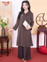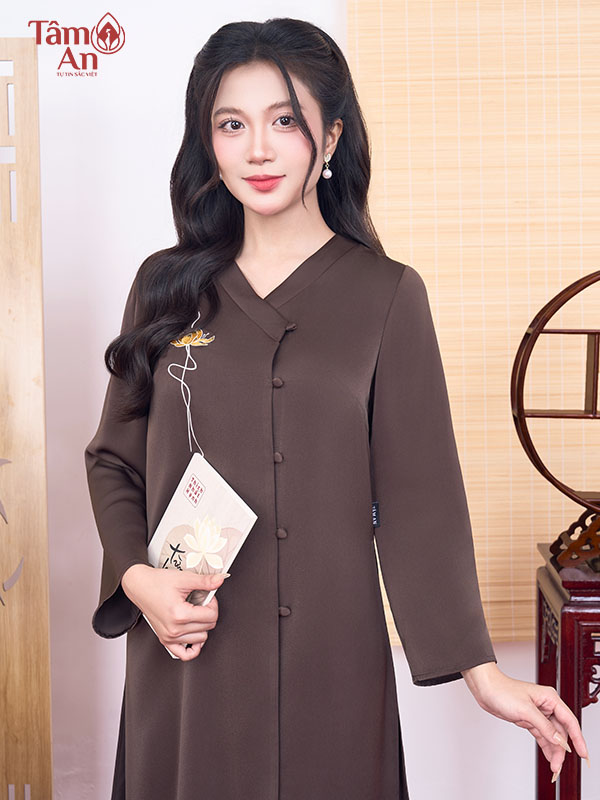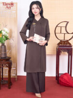 Áo dài lễ chùa Bảo Thiên được thiết kế từ lụa nhập khẩu cao cấp, mềm mịn, nhẹ mát. Form áo dài cách tân thanh lịch, kín đáo, mang vẻ trang nghiêm đúng tinh thần Phật giáo. Gam màu nâu trầm mặc đi lễ chùa, tụng kinh, khóa tu hay trong các ngày rằm, mùng 1 đều đẹp và thoải mái