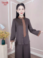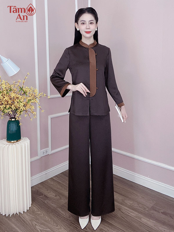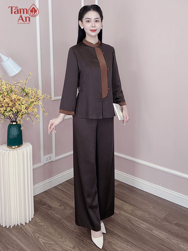 Gam nâu trầm truyền thống của Phật giáo mang ý nghĩa khiêm nhường, tĩnh tại, giúp người mặc giữ được sự trang nghiêm. Thiết kế vạt hò truyền thống, dáng suông thoải mái, không gò bó, được may tỉ mỉ từng đường kim mũi chỉ khiến bộ trang phục trở thành lựa chọn lý tưởng cho những buổi lễ chùa, vãn cảnh, làm công quả, tu thiền tại gia hay những buổi sinh hoạt đạo tràng.